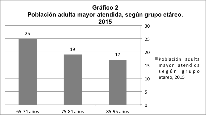 La mayoría de las personas atendidas pertenecían a los grupos de edad comprendidos entre los 65 - 75 años. De acuerdo con la perspectiva teórica de Duskin y Papalia (2001) esa edad cronológica se ubica en la categoría de viejo-joven (65 y 74 años).
