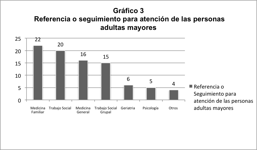 3.Referencia para valoración de servicios complementarios o especializados desde I o II Nivel de Atención: Geriatría, Nutrición, Medicina Interna, Oftalmología, Optometría, Audiometría, Psiquiatría, Fisiatría, Terapia Física, Odontología y otros.